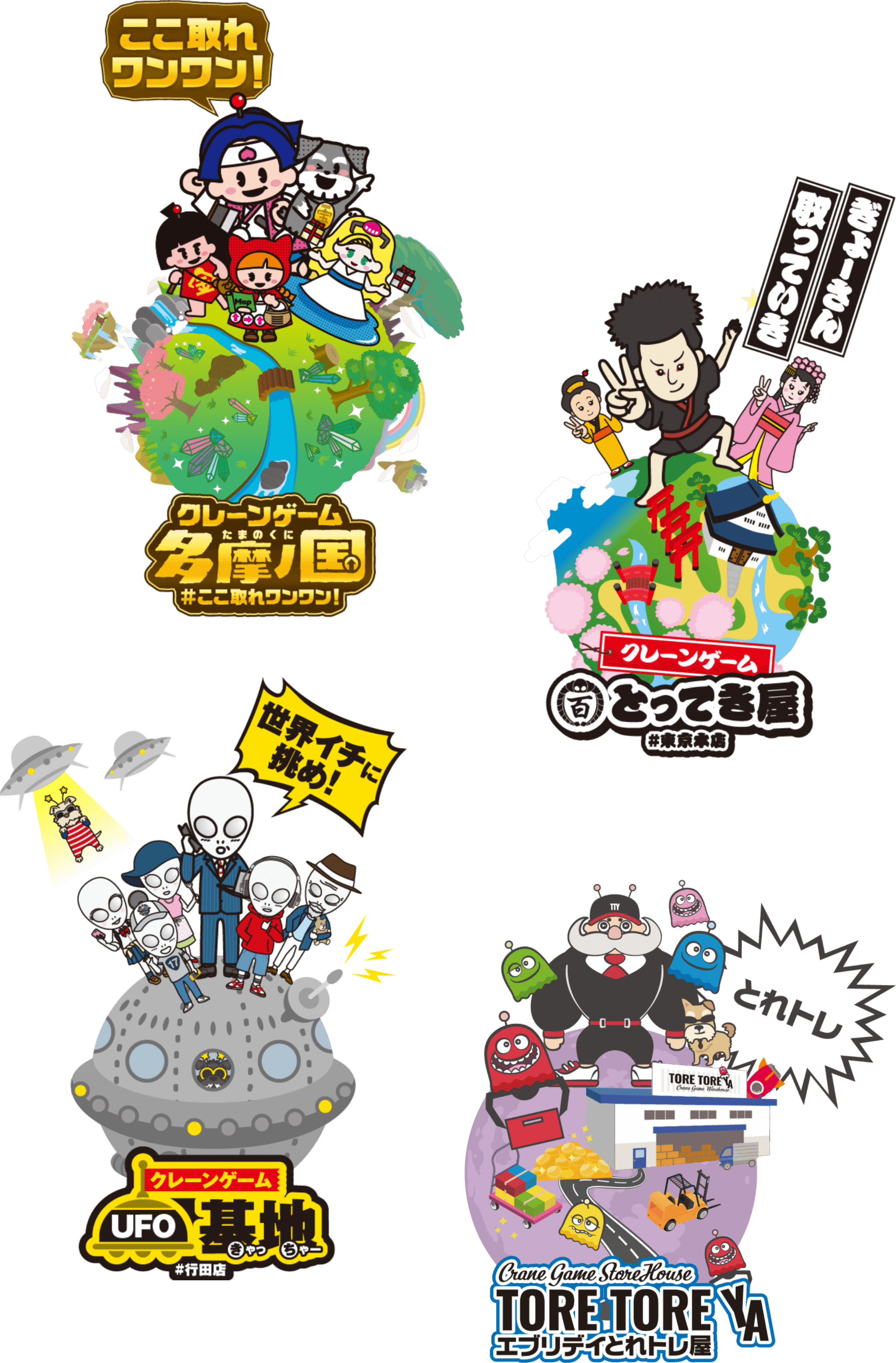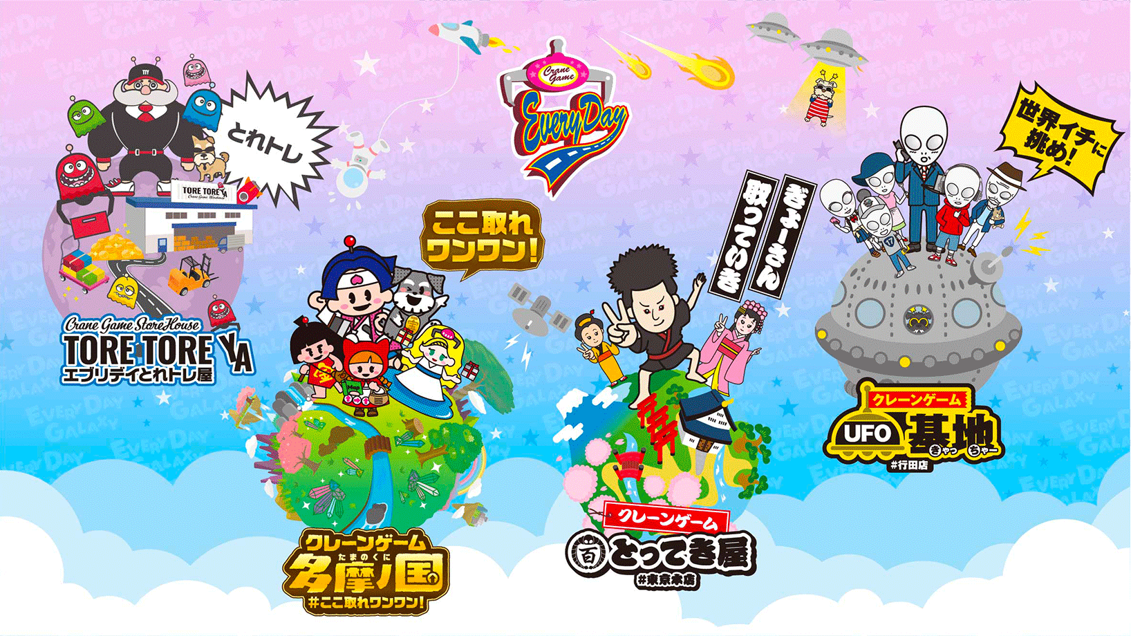 エブリデイは店舗ごとに異なるストーリー性を持ち感動がいっぱいのテーマパーク。クレーンゲームを通してお客様に感動体験をお届けします。宇宙 / 江戸 / おとぎ話 / 倉庫