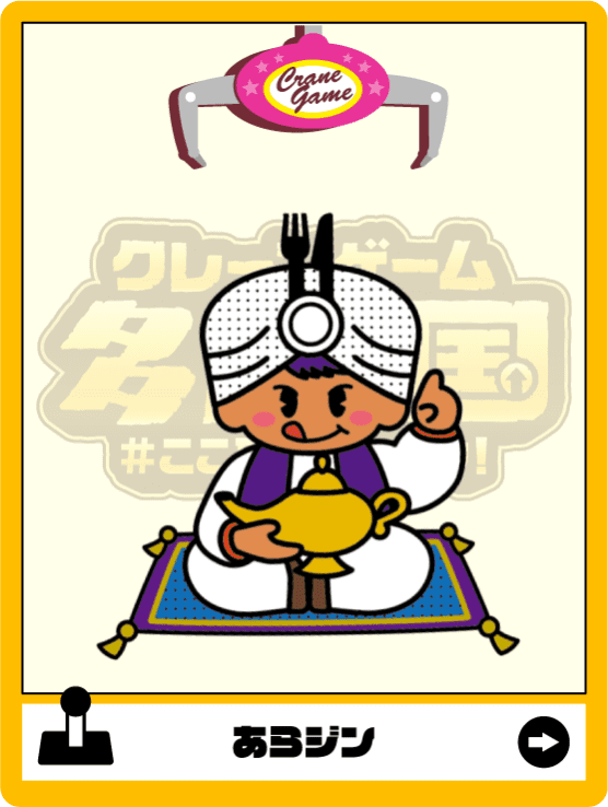 「食ッテキーヤ!」はるばるアラビア地方から魔法のじゅうたんに乗ってやってきた。魔法のランプでランプのせいを操る。グルメにうるさい。